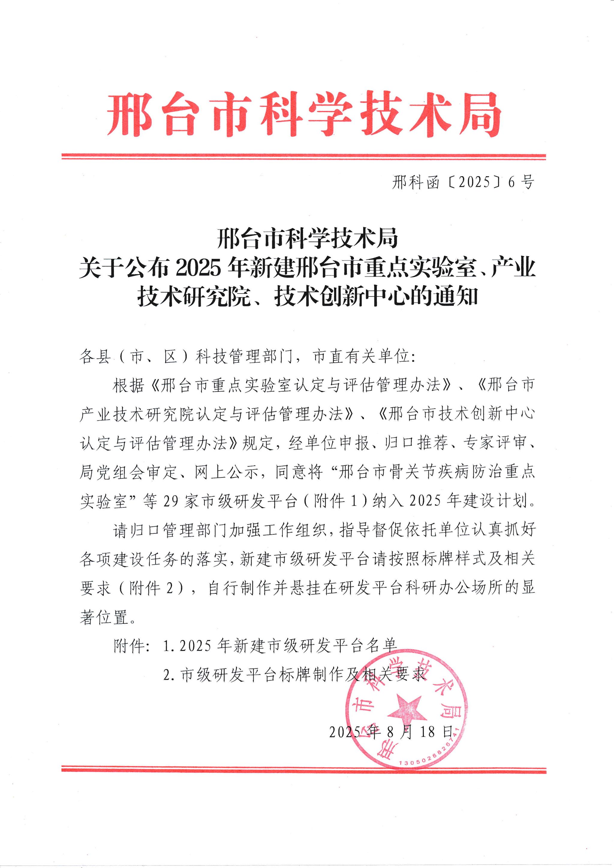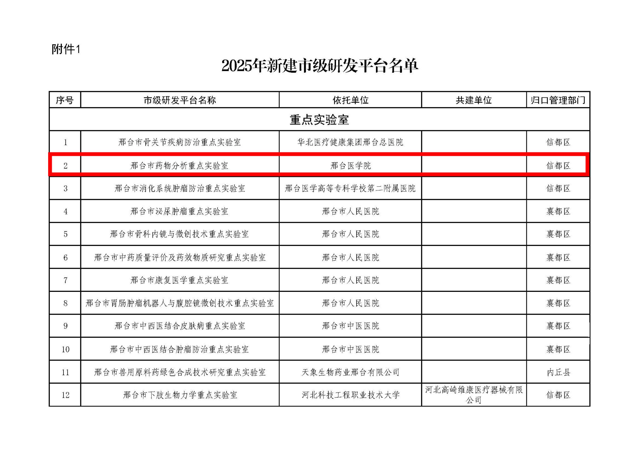 近日,邢台市科技局公布了2025年新建市级研发平台名单,我校药学系“邢台市药物分析重点实验室”入选2025年度邢台市重点实验室,标志着学校在科研平台建设方面取得了新突破。